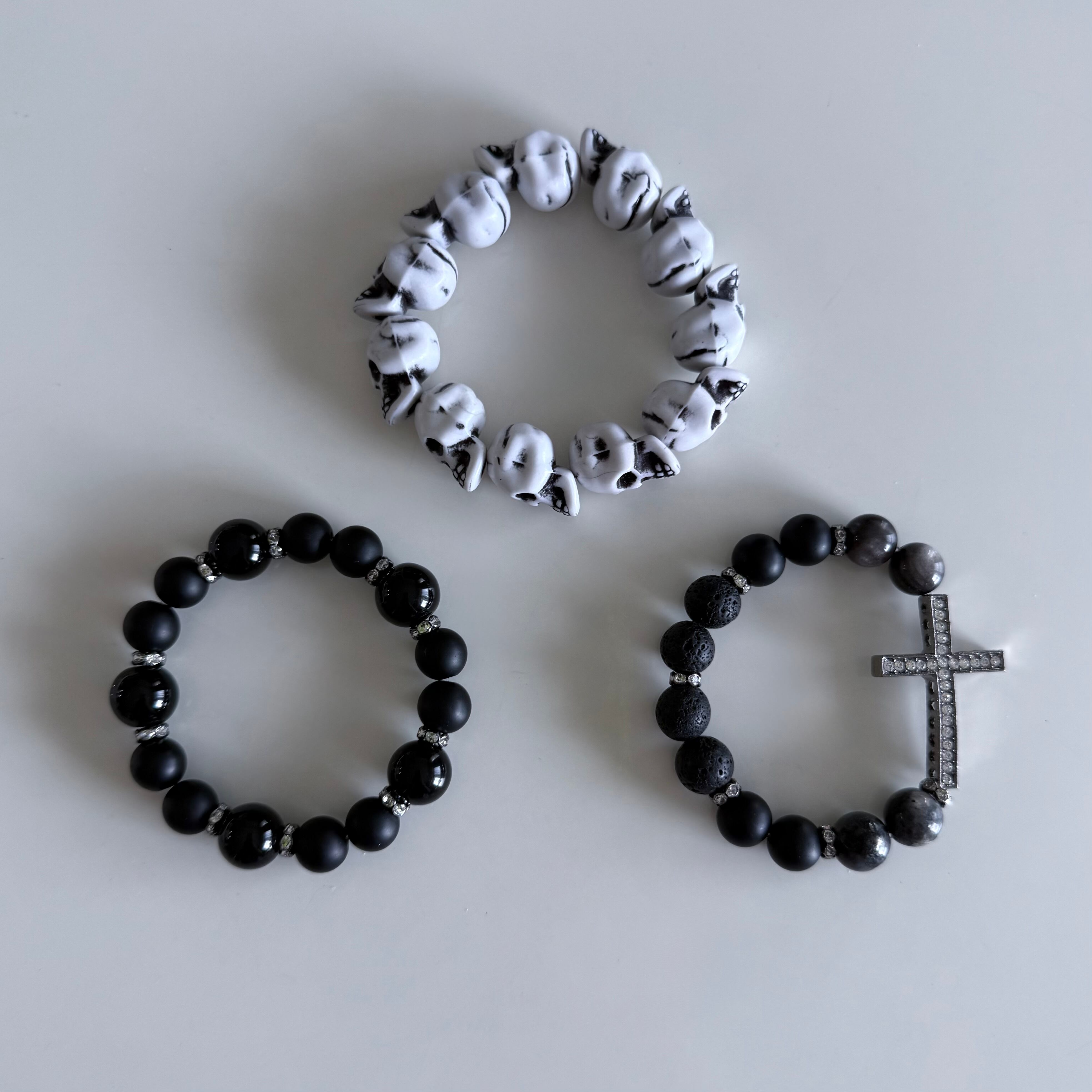 labradorite, silver obsidian, lava stone, matte black agateblack agate, brass, plastic