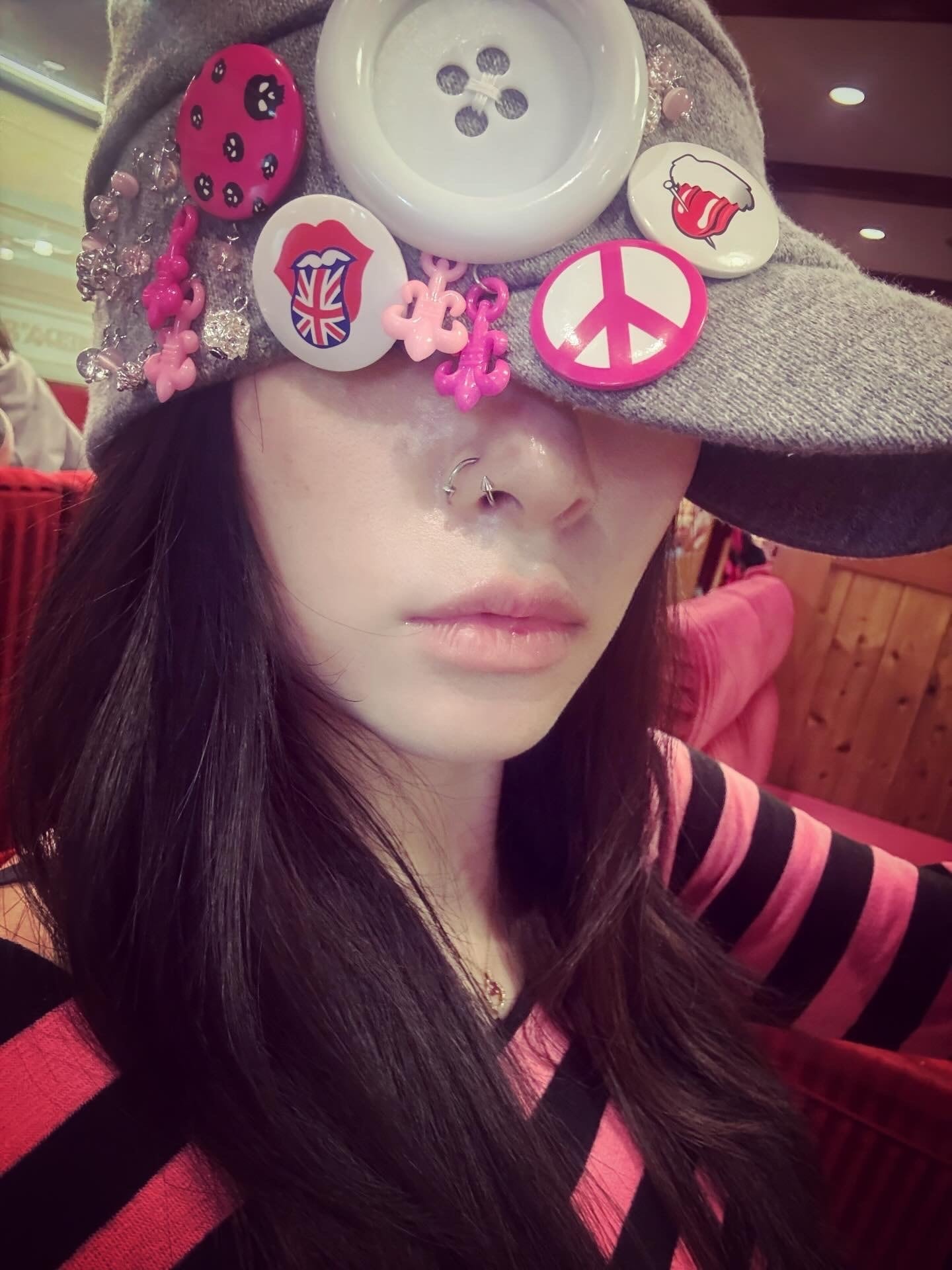 Catseye, Pink cracked stone, Glass, Plastic button, pin back badge, Plastic, Brass, Stainless steel
